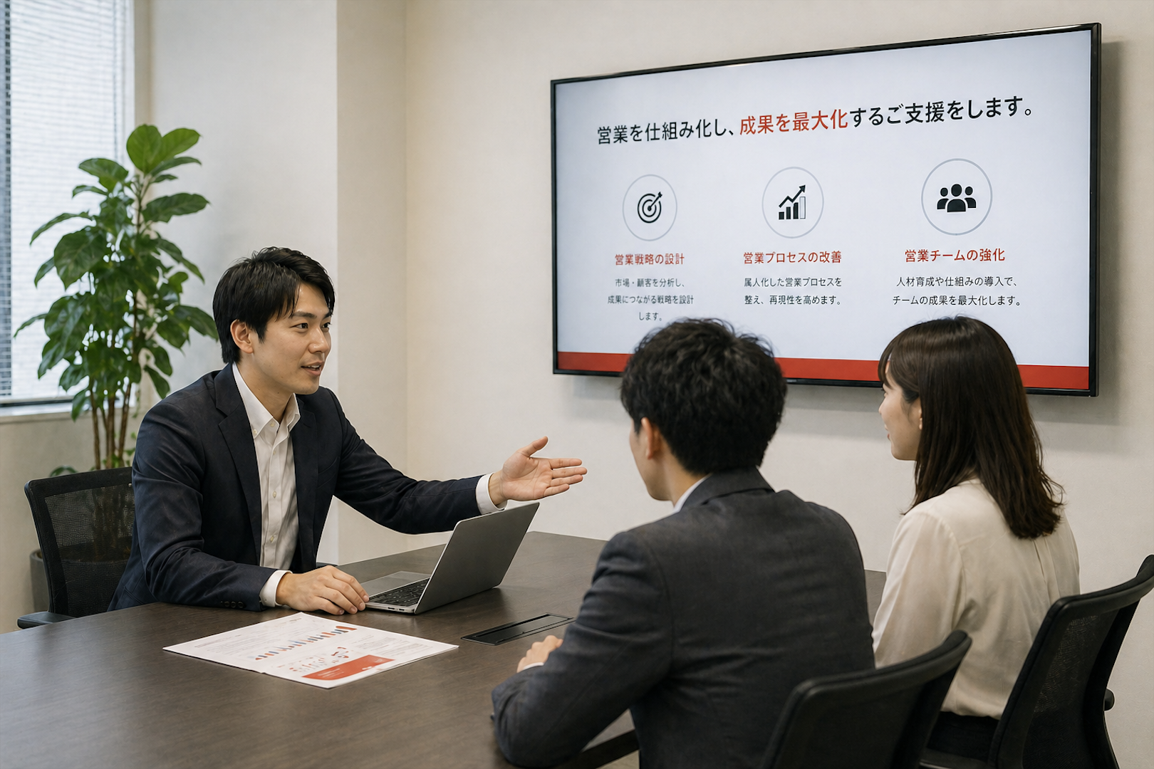 ターゲット設計から提案手法の構築、トークの言語化・マニュアル化までを一貫して行い、属人化しない営業体制を構築します。